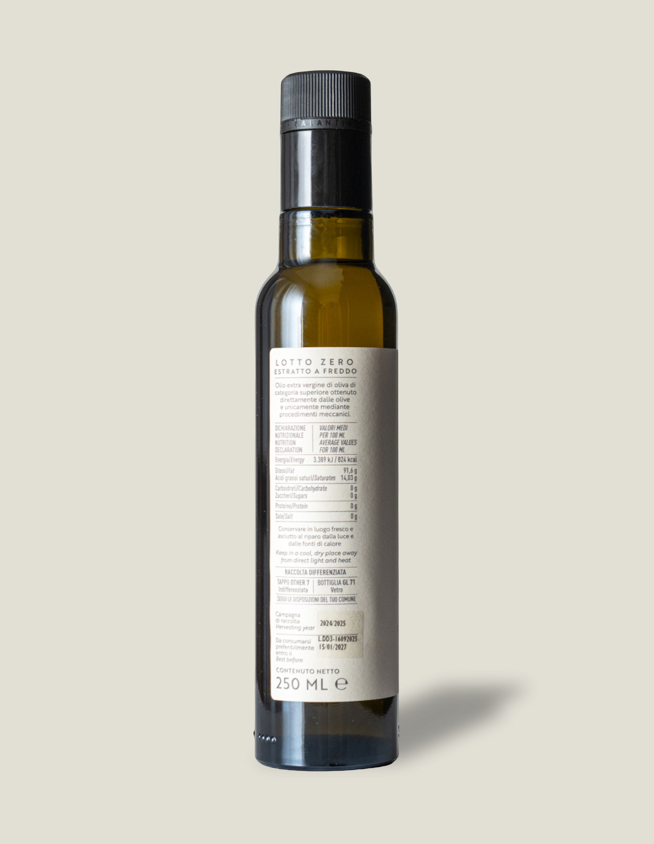 Lotto Zero è l’equilibrio perfetto tra le migliori varietà di olive. Un olio puro e naturale, senza residui chimici, che conserva tutte le proprietà benefiche dell’oliva.